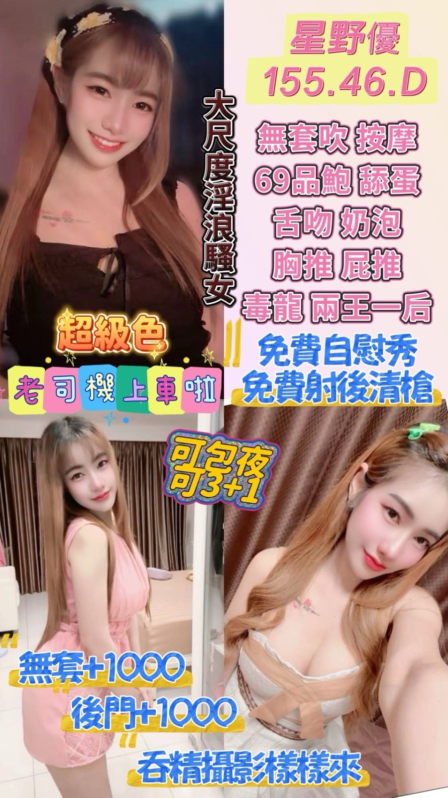 無套吹/共浴殘廢澡/親密KISS.激情舌吻(視個人衛生和妹妹現場感覺.自行開發)/按摩/奶炮 胸推/屁推/六九/品鮑/舔蛋/毒龍/兩龍一鳳/免費自慰秀/免費射後清槍