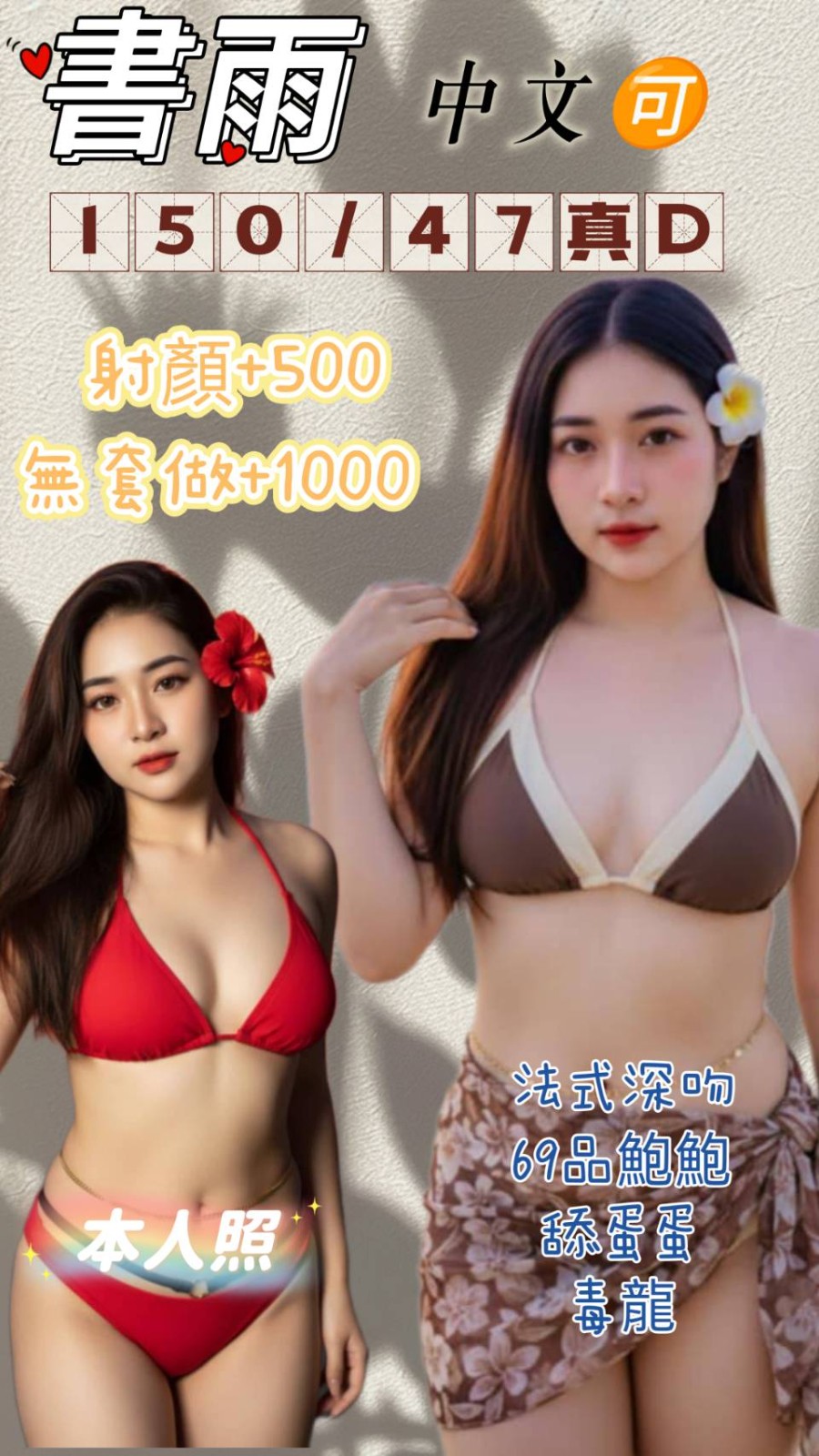 舌吻/無套吹/甜蜜共浴/69品鮑/奶泡/舔蛋/自慰秀/艷舞秀