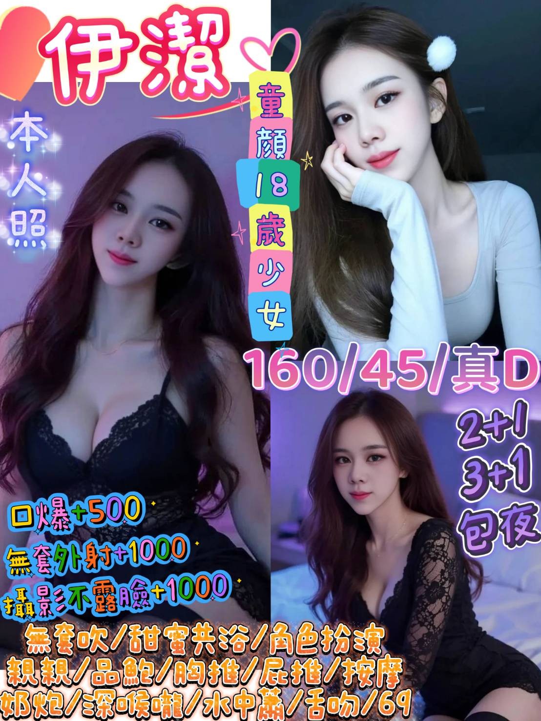 👍項目:無套吹/親親/按摩/甜蜜共浴/奶炮/品鮑/69/胸推/屁推/角色扮演/舔蛋蛋/過水+漫遊/足交/舌吻